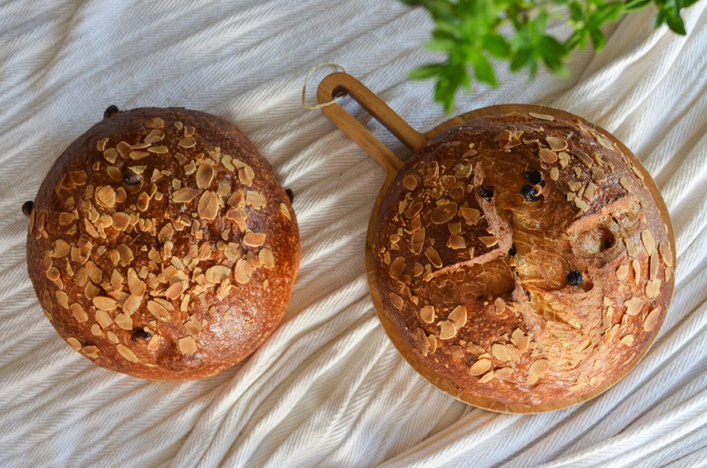 Ráno rozehřejte troubu na 180 stupňů, mazance opatrně pomašlujte, posypejte mandlemi, nařežte jemně žiletkou do kříže (pokud vypadají dost pevně), vložte do trouby a dolů na plech na vodu nebo do prohlubně na páru, má-li ji vaše trouba, nalijte 100 ml horké vody.