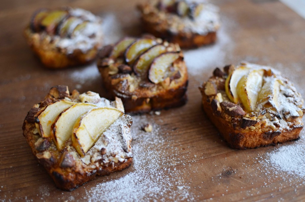 Základem je starší máslová brioška, tousťák nebo houska, umím si představit i vánočku. Stresovat vás nemusí ani případná lehká okoralost či natvrdost pečiva, stačí, že jde krájet na tlusté plátky. Vláha se do něj vpraví zpět dvěma způsoby: sladkým sirupem (já vás varovala) a máslovo-mandlovým krémem, obloženým případně trochou ovoce nebo dalšími mandlemi (samé zdraví).