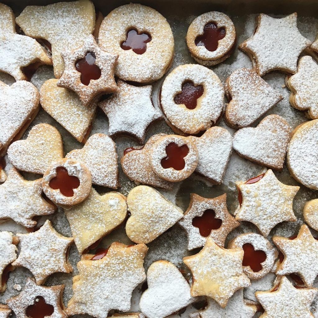 Ze suchých surovin a studeného másla vytvořte drobenku, pak zapracujte žloutky/tekutinu a vypracujte těsto. Můžete nechat odležet – my nenechaly. Válejte na tenko, ideálně mezi papíry, ale to vám děti asi nedovolí… a pečte do zlatova nebo bleda dle osobních preferencí. My aktuálně rádi i karamelovou;) Čerstvě mletá mouka to bůhvíjak neozdraví, ale dodá na chuti, o to jde. Jestli vám vaše celozrnka nechutná sama, necpěte ji tam. Po upečení pocukrujte horní deklíky, aby se džem leskl a hojně mažte džemem – kyselým, šípek, dřín nebo klasický rybíz. Ať je ho hezká vrstva, na malé kolečko o 3cm průměru stačí vylít lžičku, nepřimačkávejte, jen vrchní sušenku položte na džem. Hezky nechte nechte linecké do druhého dne rozložené – díky dostatku džemu se rozleží velice rychle i bez zakrytí a pak až poskládejte na sebe (u řidších džemů by se jinak všechen váhou horních sušenek vymačkal).