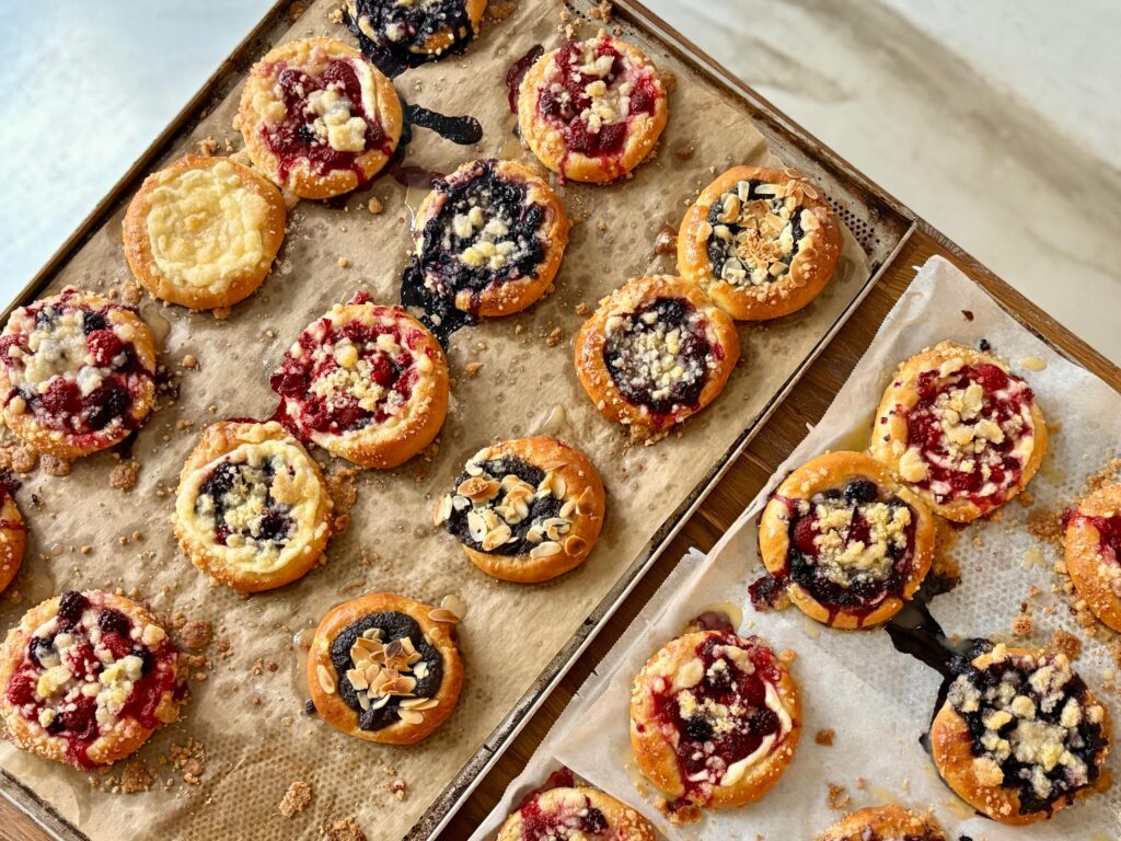 Nakynuté koláčky nechám pár minut oschnout, jsou-li na povrchu vlhké, nebo lehce potřu moukou – sklenici nebo důlkovač také „namočím“ v mouce a nakonec každý koláč orazím, naplním (dost! ovoce stavím do pyramid:), posypu ovocem, drobenkou a nechám péct asi 20-25 minut na 180 stupňů horní-dolní či 170 horkovzdušně, peču-li dva plechy. Orientujte se podle barvy a nebojte se podběračkou koláč i nadzvednout, s mraženým ovocem někdy barva kůrky klame a spodek koláče je ještě syrový. Hotové koláče potřu směsí másla a rumu (30 g másla, 15 rum), kterým potřu zejména okraje.