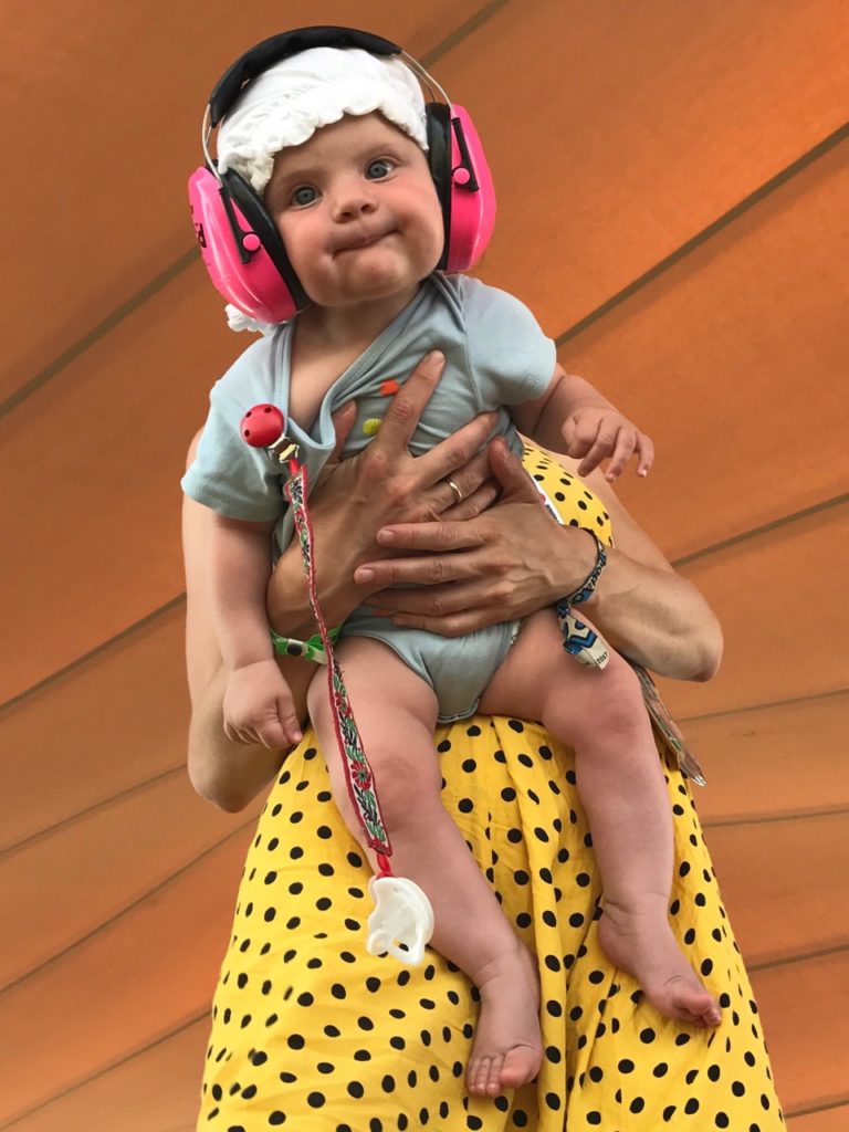 Určitě doporučuju nosítko nebo šátek. Dobře se s tím tancuje zvlášť s malým miminkem, taky se snadno prosmýknete kamkoli a nemusíte se bát, že ho někde zapomenete… Ale kočár jsme taky využívali, jako pojízdnou postel. V časech spánku jsme ho prostě odvezli od stanu (všichni parkují kočárky u stanů) a spící Žofku odkládali i s nosítkem do jedoucího! kočárku. Usnout v něm neuměla, ale když se povedlo odložit s přiklopit sluchátky, spala krásně a pohodlně i ve vedru (světlý a s prodyšnou střechou je výhoda/nutnost, samozřejmě). Víceméně jsme fungovali v podobném rytmu, jako doma. Jen večerní spánek obvykle zahájila na jednom z hlavních koncertů, které jsme pak preventivně opouštěli v polovině/druhé třetině, aby se probudila až ve stanu s možností nakojit se a spát dál.