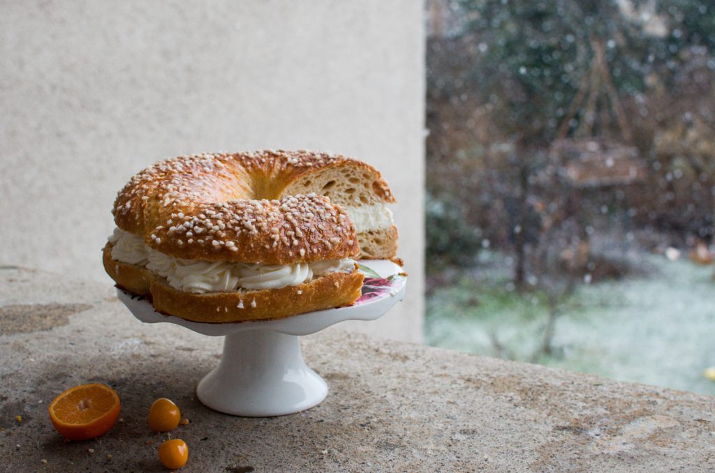 Tvarování: Těsto si rozdělte na 2 stejné bochánky a každý utáhněte do ranečku. Nechte 15 minut odpočívat, pak uprostřed vytvořte díru a opatrně roztáhněte na donut – věnec. Lze udělat i hada a toho spojit, ale výsledek se víc trhá a spoj je vidět (je to ta verze na obrázku), takže doporučuju první jmenovaný způsob. Počítejte s tím, že věnec nakyne opět skoro na 2x, takže se nebojte širšího obvodu.