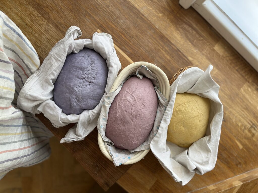 Všechny tři recepty vychází z podobného poměru, mění se hlavně barevná a zvláčňující zeleninová příměs – buď je tam kouse dýňového pyré, mrkové kaše, popřípadě vařená brambora a výluh z byliny zvané klitorie (na vzorku na natáčení bylo brambory jen malinko, což sice jde, ale chleba pak mnohem rychleji stárne, tedy vysychá). Pokud byste chtěli použít místní variantu, teorericky by šel i sléz nebo hrachor (jemuž je tahle bylina příbuzná), ale protože v mém dosahu nerostou, beru za vděk touto super výkonnou barvířskou jistotou.