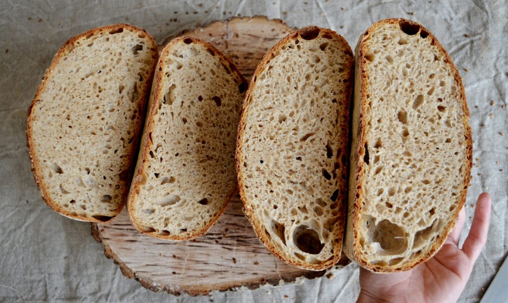 Těsto je vážně jednoduché a i bez triků s autolýzou, zvláštním vařením mouky, případně chlazením jednotlivých fází v lednici se chová naprosto příkladně. Kyne pěkně svižně, ale ani jednou jsem z něj neměla placku (dokonce ani v případě, kdy mi na bochník na lopatě spadl z půlmetru telefon, což je celkem extrémní test), relativně dobře se do něj řeže i za tepla, pokud ovšem nezačnete zvedat hydrataci.